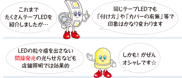 • これまでたくさんテープLEDを紹介しましたが…同じテープLEDでも「付け方」や「カバーの有無」等で印象はかなり変わります LEDの粒々感を出さない間接発光の光らせ方なども店舗照明では効果的 しかも!がぜんオシャレです☆